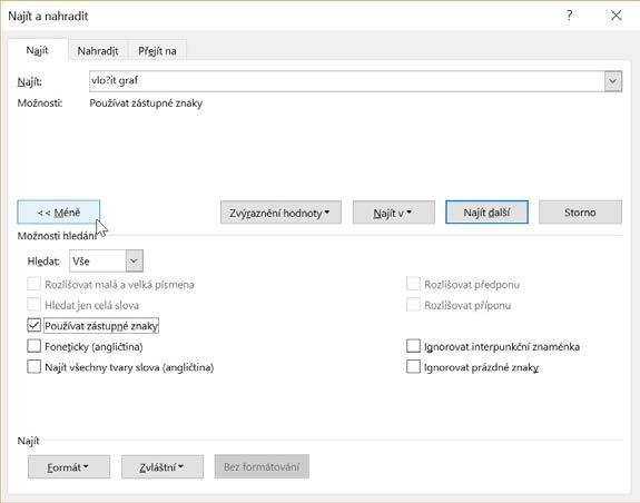 Zvláštní – hledá na základě speciálních znaků, jako jsou tabulátory, konce odstavců, oddílů a podobně.