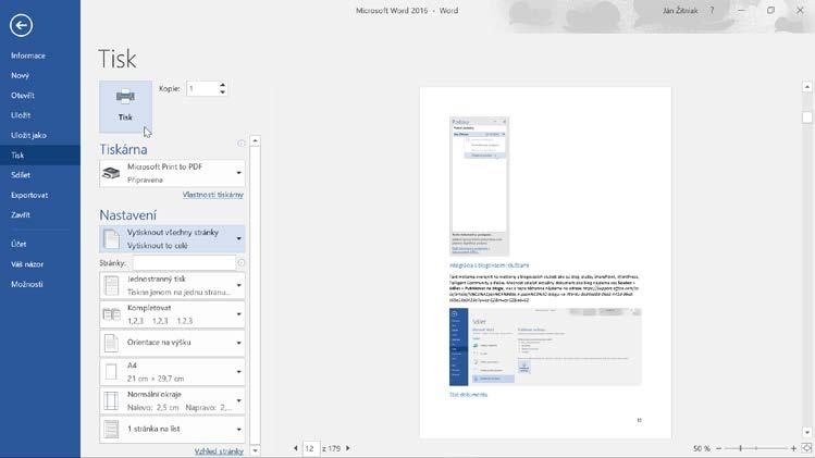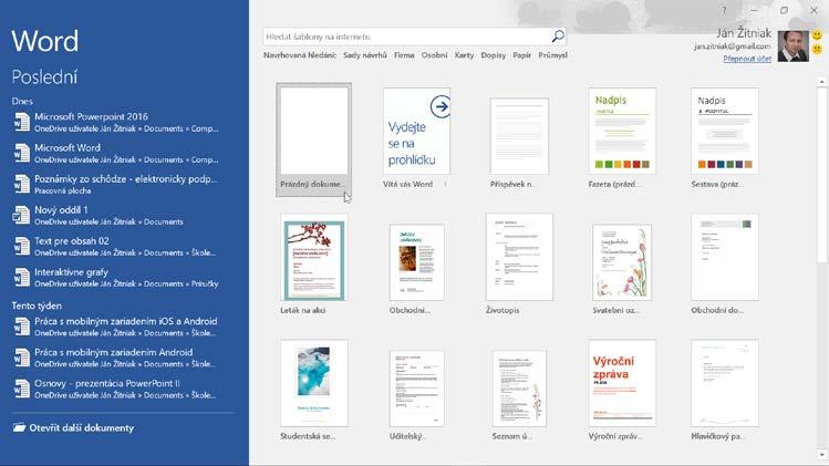 Po spuštění Wordu se vlevo zobrazí historie naposled otevřených souborů. Napravo máte k dispozici náhledy k jednotlivým šablonám společně s možností vytvořit prázdný dokument. Tím při vytváření jakéhokoliv nového dokumentu začnete.