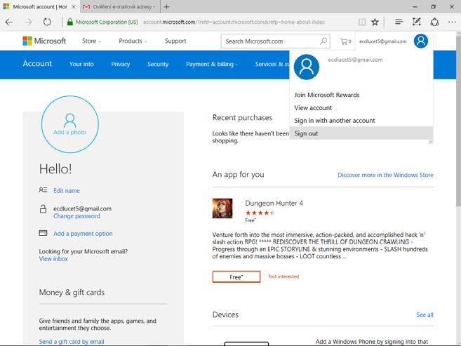 Obrázek Ú.3: Nově vytvořený účet Microsoft