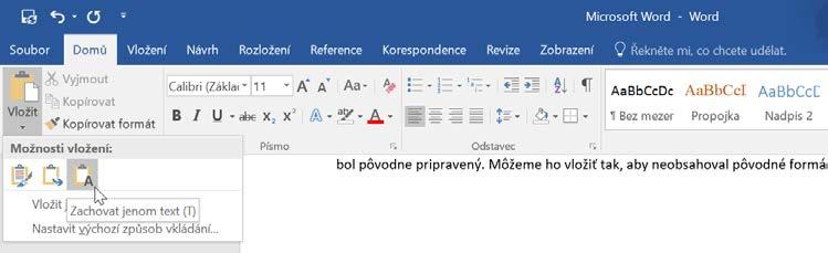 Zkopírovaný nebo vyjmutý text nemusíte po obsahové a formátové stránce vkládat tak, jak byl původně připraven. K tomu poslouží další možnosti příkazu Vložit, které zobrazíte klepnutím na šipku. Zkopírovaný obsah (v tomto případě text) můžete vložit tak, aby neobsahoval původní formátování (vyberte Zachovat jenom text), případně aby sloučil formátování zdroje (čili zkopírovaného obsahu) s formátováním cíle, tj. místa, kam text vkládáte (vyberte Sloučit formátování).
