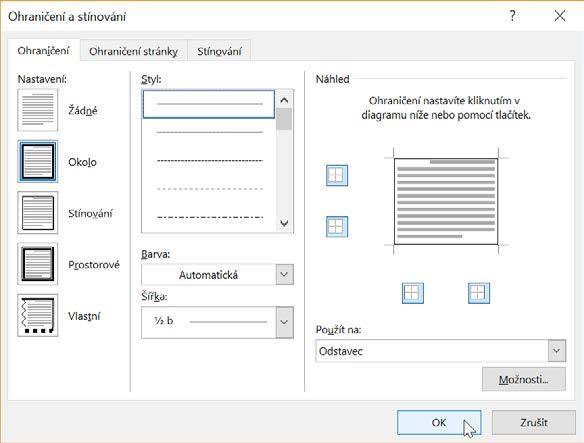 Někdy se hodí orámování (ohraničení) textu. Po označení vybraného obsahu vyberte jedno z orámování příkazem Ohraničení. Vlastní ohraničení nebo stínování definujete přes Ohraničení→Ohraničení a stínovaní V okně Ohraničení a stínovaní úplně vlevo zvolte nastavení orámování (například Okolo). Vpravo nahoře najdete Styl, Barva, Šírka, úplně vpravo potom Náhled, kde vidíte vámi zvolená nastavení.