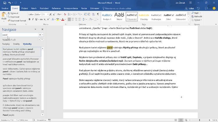 Navigační okno v záložkách kategoricky zobrazí nadpisy v dokumentu (Nadpisy), náhledy na strany (Stránky) a výskyt nalezených klíčových slov spolu s odstavci, kde se nacházejí (Výsledky) – ty vidíte automaticky jako první.
