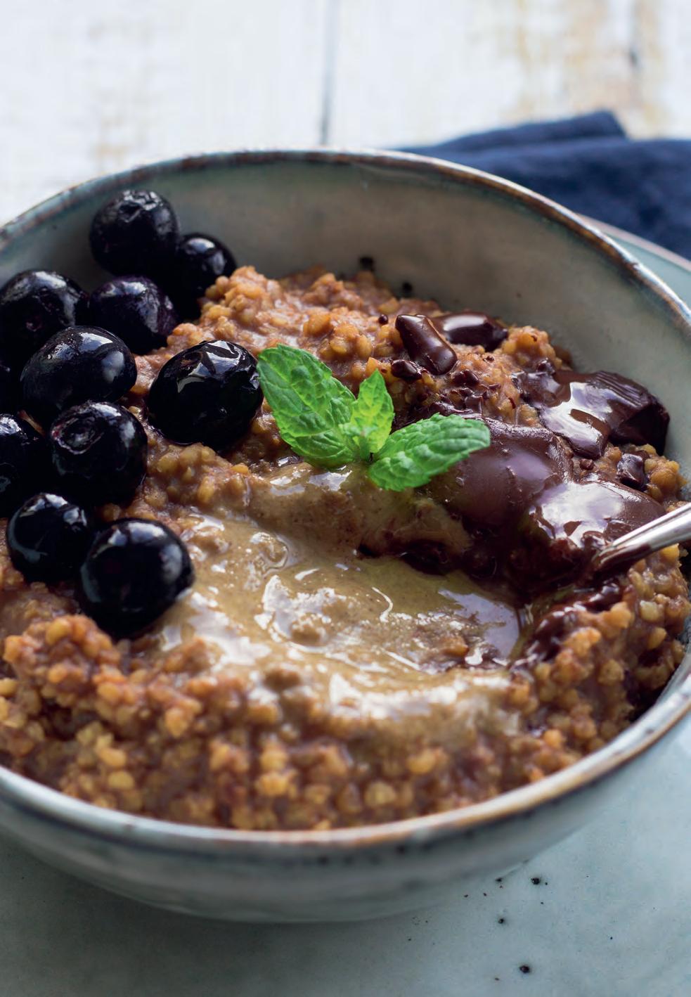 V hrnci přivedeme k varu vodu společně s espressem a špetkou soli. Ztlumíme plamen, do hrnce vsypeme jáhly a pod pokličkou je necháme vařit. Po 5–7 minutách přidáme mléko a za občasného míchání vaříme dalších 10 minut. Teplou kaši naservírujeme do misky, přidáme hořkou čokoládu, lžíci arašídového másla a hrst borůvek.