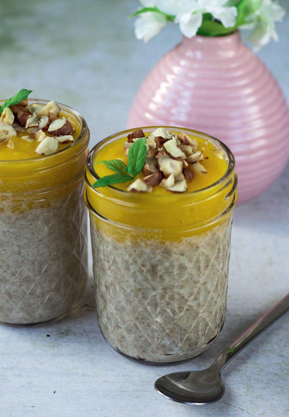 Vločky nasypeme do misky, zalijeme je stejným množstvím vody a při pokojové teplotě je necháme namáčet (nejlépe přes noc). Mango oloupeme, nakrájíme na větší kousky a rozmixujeme na pyré. Hotovou kaši naservírujeme do misek nebo skleniček, přidáme pyré z manga a vše na závěr ozdobíme nasekanými oříšky.