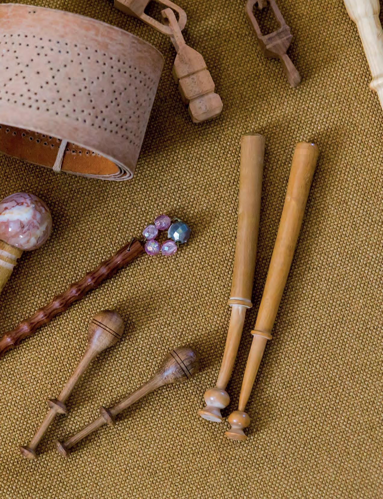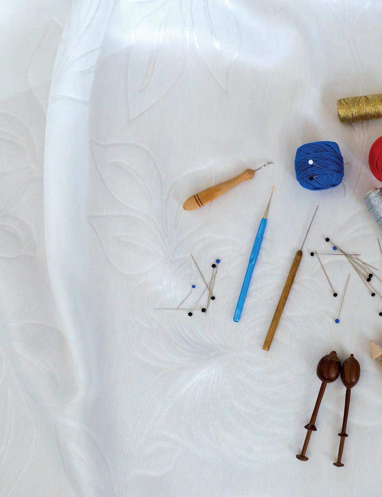 Lampička na svícení, tvrdý štětec na tužení, plátno na napařování, žehlička, fén na vysoušení tužidla, kufřík na paličky a krajkářské pomůcky, jehly, šicí hedvábí, lupa.