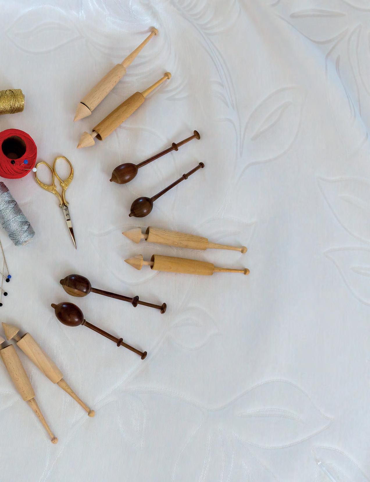Během paličkování je potřeba mít po ruce háček, který je používán velmi často, byť s malou oblibou. Spojují se jím části vzoru na herduli, páry při začínání i zakončování. Každá krajkářka má háčků několik a jejich sílu volí podle použitého materiálu. Číslování háčků je různé podle výrobce. Doporučuji vám pořídit si japonský háček zn. Tulip č. 18 / 0,7 mm (čím vyšší číslo, tím slabší háček). Při koupi si nechte ukázat více háčků a vyberte si ten, který bude mít nejdelší zobáček (s mělkým zobáčkem se těžko protahují nitě). Podle své zkušenosti nedám dopustit na jemné háčky našich babiček, takové mít je hotový poklad.