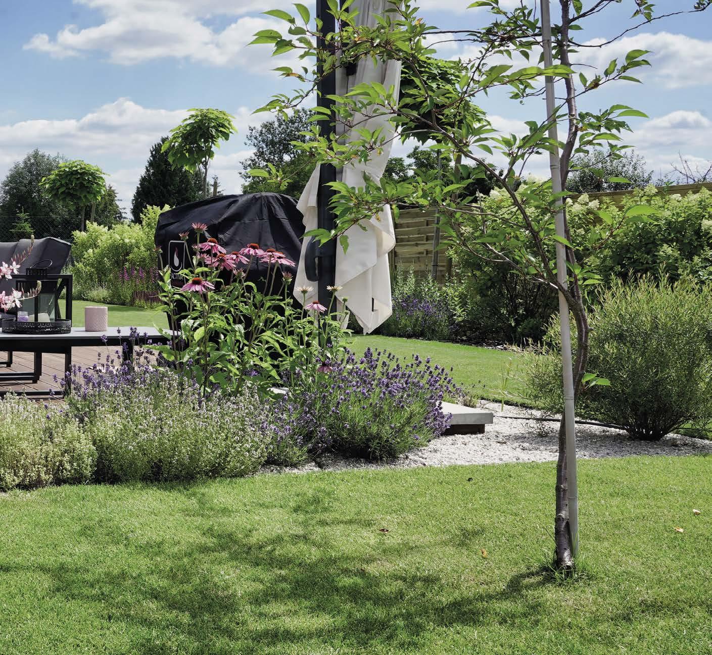 Krásnou zahradu dělá svěží trávník, dobře prosperující rostliny a také místa k sezení a chodníčky.