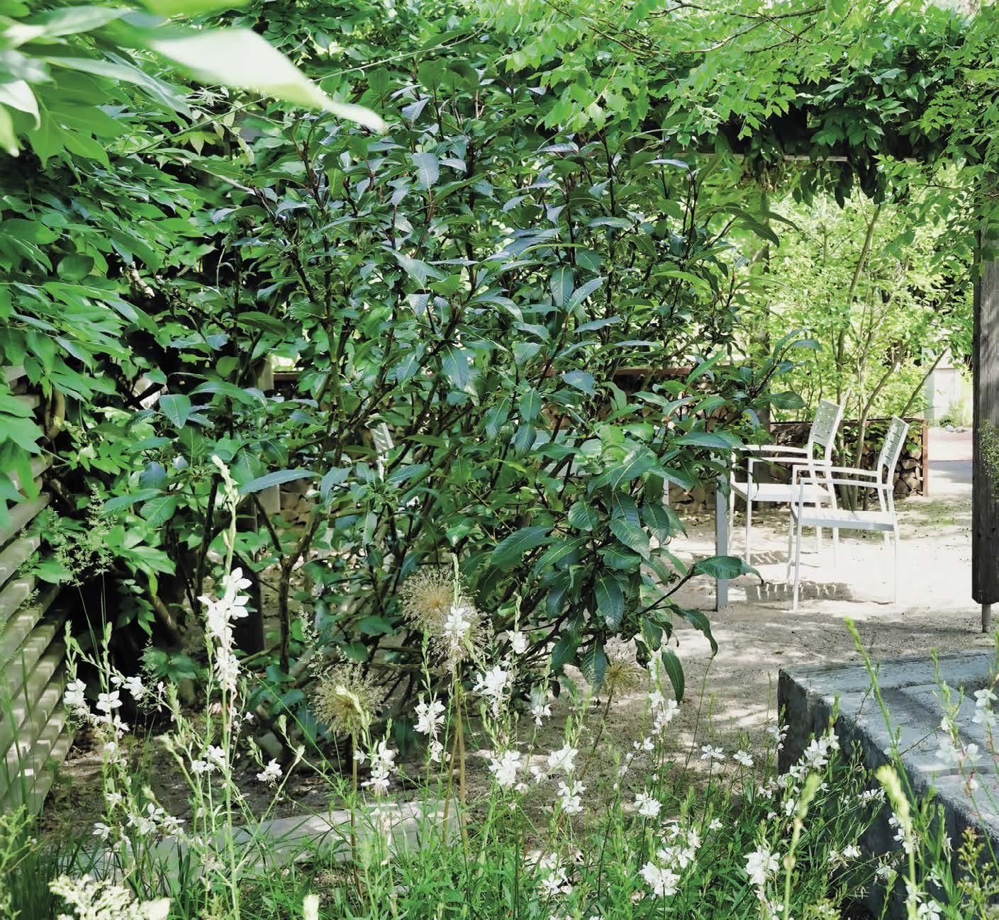 Zahrada působí velmi čistě a elegantně, není příliš barevná, ale díky stálezeleným bobkovišním podél plotu a buxusům je i v zimě hezky zelená.