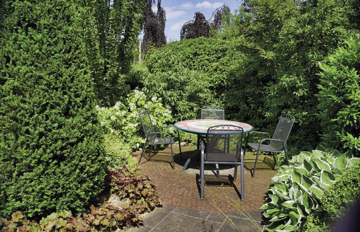 Zahrada je v polostínu, orientovaná na východ. Nabízí příjemné místo k posezení. Dominantní jsou hortenzie, které polostín milují.