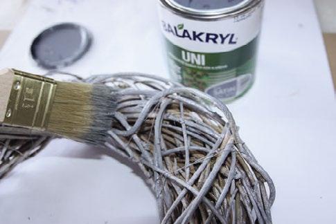 6. Na bílý nátěr naneseme ještě šedý a zase tak, aby místy prosvítal předešlý bílý. Budoucí věnec bude působit vintage dojmem.
