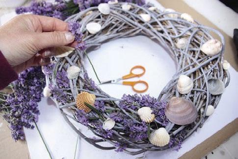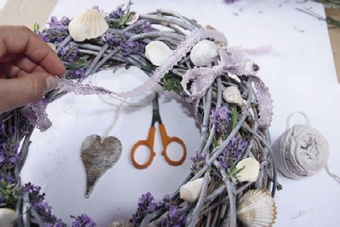 9. Levandule pak mezi větvičky dobře zaklíníme, aby později z věnce nevypadly. Obecně platí, že čerstvé přírodniny nelepíme (doporučuje se drátek), protože postupným sesycháním za pár dní většinou odpadnou. Protože jsou květy levandule ale lehké a drobné, postačí je pouze zastrčit mezi šlahouny a v případě potřeby je přilepit až po usušení.