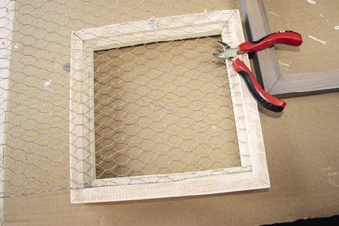 4. Po zaschnutí barev můžeme rámečky nalakovat. Pak je otočíme a v zadní části na ně přiložíme králičí pletivo, které odměříme a kleštěmi odštípneme potřebnou velikost.
