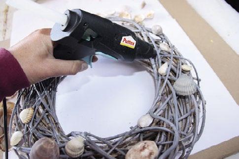 Co budeme potřebovat: šlahouny vistárie (psího vína, chmelu nebo větvičky kroucené vrby) • mořské mušle • zahradnické nůžky • tenký drátek • tavicí pistoli • štětec • akrylové barvy • krajku (zde růžovou) • malé dřevěné srdíčko • bílý provázek