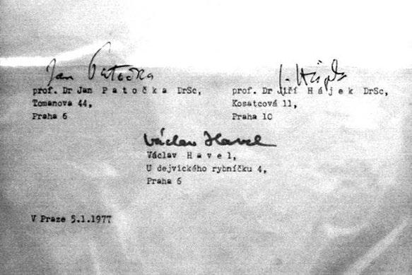 Podpisy prvních mluvčích Charty 77 Václava Havla, Jana Patočky a Jiřího Hájka