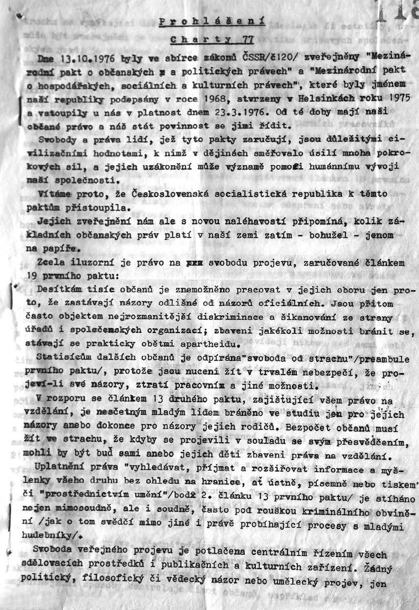 Prohlášení Charty 77, jehož cílem bylo poukázat na to, že se v normalizačním Československu nedodržují mezinárodní úmluvy, které podepsal i sám tehdejší prezident republiky, nese datum 1. ledna 1977. Text Prohlášení sepsali dramatik Václav Havel a spisovatel Pavel Kohout. Autoři však záměrně zůstali v anonymitě, Prohlášení mělo být hlasem všech jeho signatářů.
