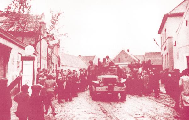 Vůz s americkými vojáky zastavil 6. 5. 1945 před naším obchodem, dva chlapci obrácení zády k fotografovi jsme nejspíš my dva s bratrem před obchodem.