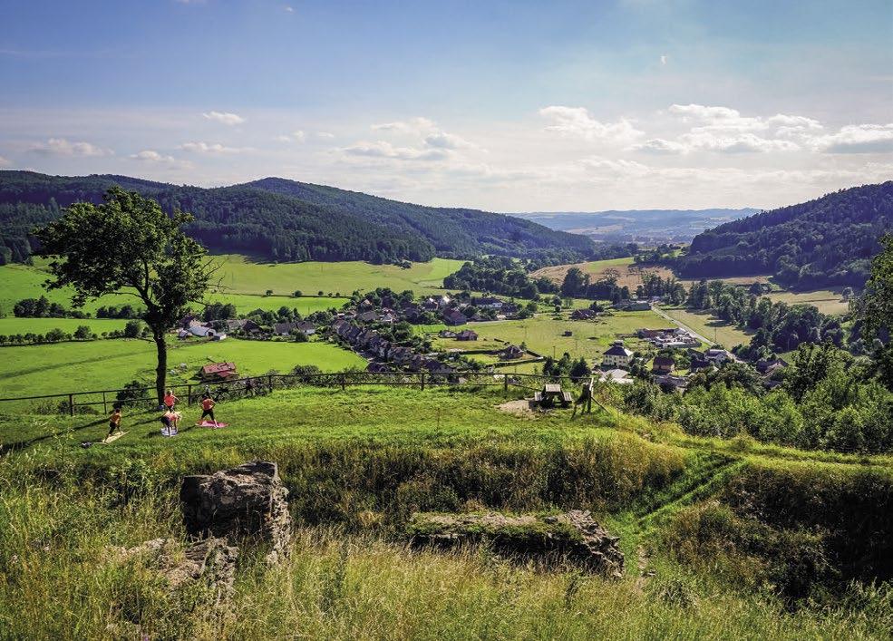 odměna v podobě krásných výhledů na celou obec i okolní krajinu. Na chvíli se úplně zastavím a naplno vychutnám slábnoucí sluneční paprsky a také se zaposlouchám do přirozených zvuků doléhajících až z vesnice. Sekačka trávy, ovce, cinkání zvonků. Cítím tady úžasnou ener�ii. �idé sem prý chodívají cvičit j��u. �kolí zříceniny působí upraveně, nabízí posezení i veřejné ohniště. Pokud si s sebou vezmete špekáčky, máte vyhráno.