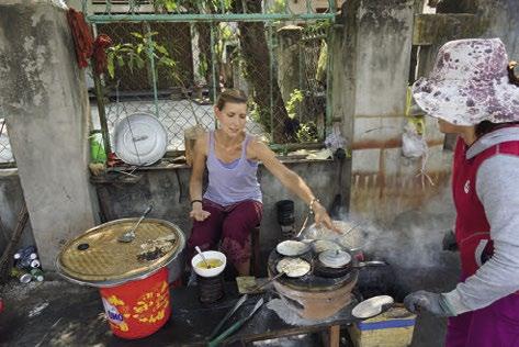 Na rýžovou placku Bánh xèo (typickou pro oblast středního Vietnamu) připravovanou na ohni mě místní pozvali – ale mohla jsem si ji i vyzkoušet upéct.