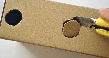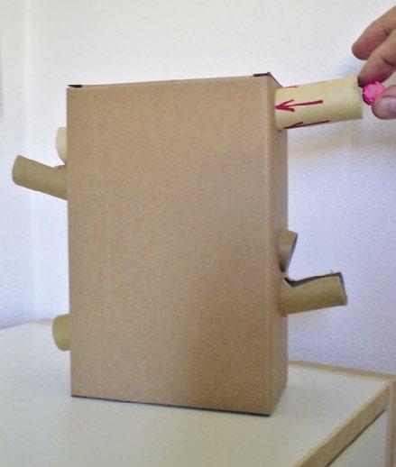 Trubičky povedou skrz krabici postavenou na bok. Musejí mít mírný sklon, aby kulička dobře jela, ovšem nesmí jet zase příliš rychle. Ostrým nožíkem vyrobte v bocích krabice otvory pro vložení trubiček. Ty musejí být střídavě skloněny na jednu či druhou stranu, aby se kulička pohybovala „cik-cak“ doleva a doprava. Na konci každé trubičky musí kulička spadnout do následující trubičky, proto boční stěnu každé trubičky na začátku seřízněte do vzdálenosti několika centimetrů.