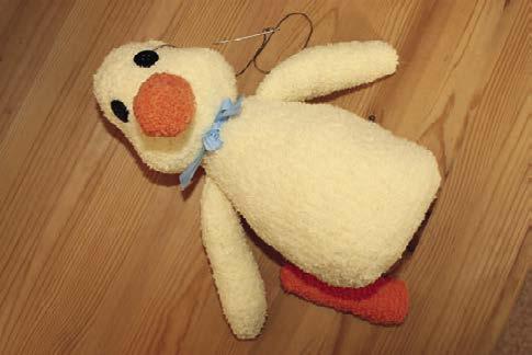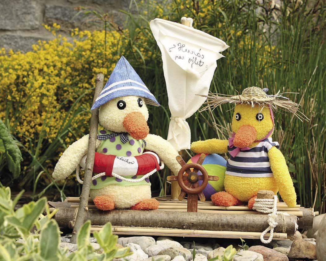 Co budeme potřebovat: na výrobu kachniček: chlupaté ponožky (na jedno zvířátko vždy 1 pár ve žluté, bílé nebo krémové barvě) • 1 ponožku v oranžové barvě • vatelín • jehlu • nitě v barvách ponožek • nůžky • 2 knoflíky na oči • tenký černý fix • obyčejnou tužku • látkové stužky • staré oděvy nebo zbytky látek • filc v libovolných barvách • tavicí pistoli • malý slaměný klobouček a suchou trávu • malý polystyrenový korpus a kouli • prádelní šňůru • červenou látkovou stuhu • noviny • akrylové barvy • tenký štětec na výrobu voru: rovné suché větve (průměr zhruba 3–4 cm) • pilku na dřevo • bambusové tyčky nebo suchý rákos • suchou trávu • sololitovou desku nebo překližku • dřívka od nanuků • kroužek na zavěšení záclon • větší hnědý knoflík • tenký černý fix • zahradnické nůžky • řezací nůž • pravítko • přírodní provázek • zbytek bílé látky • kousek silnějšího bílého provázku • korkový špunt • nůžky