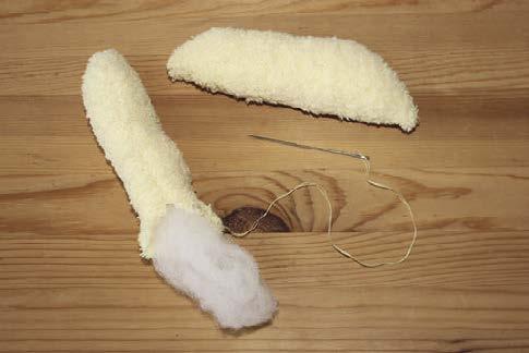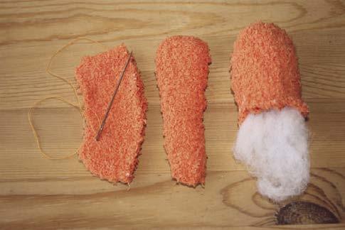 6. Z ustřižené špičky vyrobíme zobáček, z proužků ušijeme nožičky. Všechny části rovněž vycpeme vatelínem a začistíme.