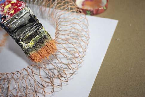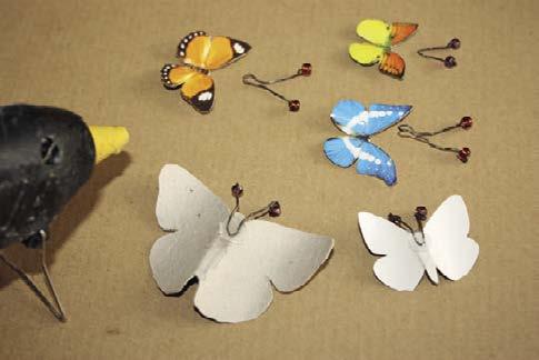 Co budeme potřebovat: králičí pletivo • kleště • tenký drátek • štětec • oranžovou akrylovou barvu • libovolné stužky, lýka nebo provázky • obrázky motýlků z časopisu nebo balicího papíru • nůžky • pravítko • fix • tvrdý papír – např. krabici od bot nebo od dortu • univerzální lepidlo • malé korálky • tavicí pistoli