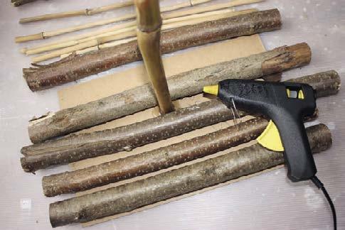 3. Tavicí pistolí nalepíme nařezané větve na uříznutou desku. Doprostřed umístíme silnější bambus jako stožár na vlajku, který tavicí pistolí dobře zafixujeme k desce i k větvím.