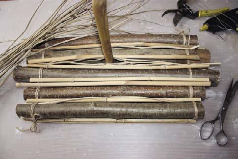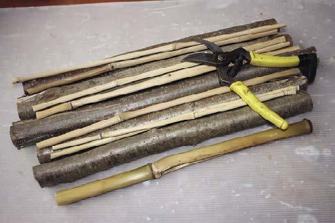 1. Vytvoříme základ voru, dospěláci vám jistě rádi pomohou. Rovné suché větve nařežeme pilkou na dřevo na potřebné délky. Bambusové tyče nebo rákos nastříháme zahradnickými nůžkami.