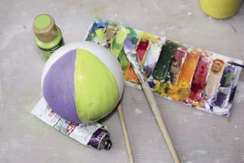12. Z polystyrénové koule vyrobíme míč. Nejdříve si obyčejnou tužkou rozdělíme kouli na 6 stejných dílků a ty pak natřeme každý jinou barvou.