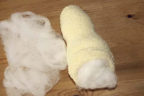 1. Připravíme si vatelín. Aby se s ním dobře pracovalo, nejdříve ho rozcupujeme na kousky a načechráme. Potom jím asi do dvou třetin vycpeme jednu ponožku – z první vyrobíme hlavičku a tělíčko. Již v tomto bodě se snažíme myslet dopředu na to, do kterých míst je potřeba dát vatelínu více, abychom ho pak při tvarování obličeje a bříška kachničky měli v ponožce dostatek. Spodní část ponožky sešijeme vnitřním stehem (tím nebude poznat, že jsou ponožky sešity).