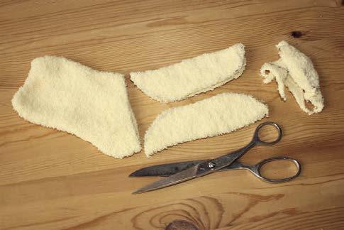 5. Z oranžové (či jinak vhodně barevné) ponožky ustřihneme její špičku a dva proužky široké asi 4 cm.