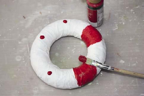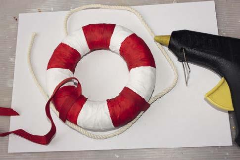 13. Z polystyrenového korpusu vyrobíme záchranný kruh. Pro větší autentičnost ho můžeme nejdříve omotat látkovou náplastí. Pak kruh natřeme dvakrát bílou barvou, necháme zaschnout a namalujeme červené pruhy.