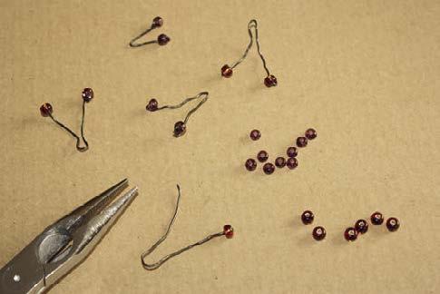 14. Z tenkého drátku vytvoříme tykadla. Postupuje tak, že kleštěmi odštípneme asi 5 cm dlouhé kousky, v polovině je přehneme a na oba konce navlékneme malé korálky. Konce drátku stočíme, aby se korálky nemohly vyvléct.