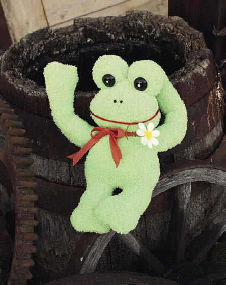 Podobně vyrobíme také jiná zvířátka – například žabičku. Postupovat budeme stejně jako u kachničky s tím rozdílem, že první ponožku ve spodní části (asi do jedné třetiny) nastřihneme nůžkami. Tím vytvoříme nožičky, pak teprve ponožku vycpáváme a sešíváme. Z druhé vyrobíme žabičce ručičky.