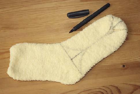 2. Z druhé ponožky vyrobíme křídla. Postupujeme tak, že si nejdříve místa, kterými povedeme střih, předkreslíme tenkým fixem.