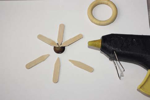 Ustřižené konce dřívek sestřihneme do špičky a tavicí pistolí je nalepíme na rubovou stranu hnědého knoflíku, který bude tvořit střed kormidla.