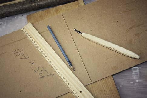 2. Pravítkem naměříme sololitovou desku či překližku, tužkou vyznačíme body a podle těch desku pomocí ostrého nože uřízneme. Deska by měla být kratší než základ voru, aby nebyla příliš vidět.