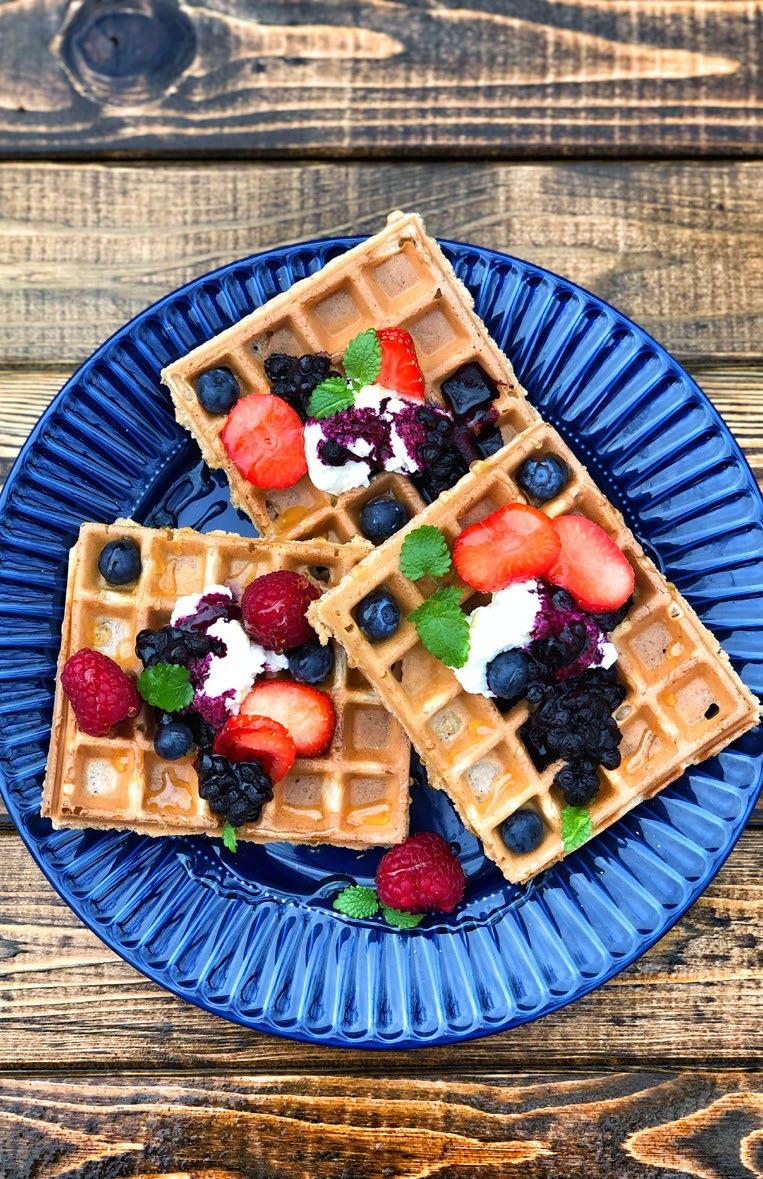 Podáváme se 100 g jogurtu a ovocem dle chuti. Já mám vafle nejraději s rozvarem z borůvek a dozdobené drobným ovocem.