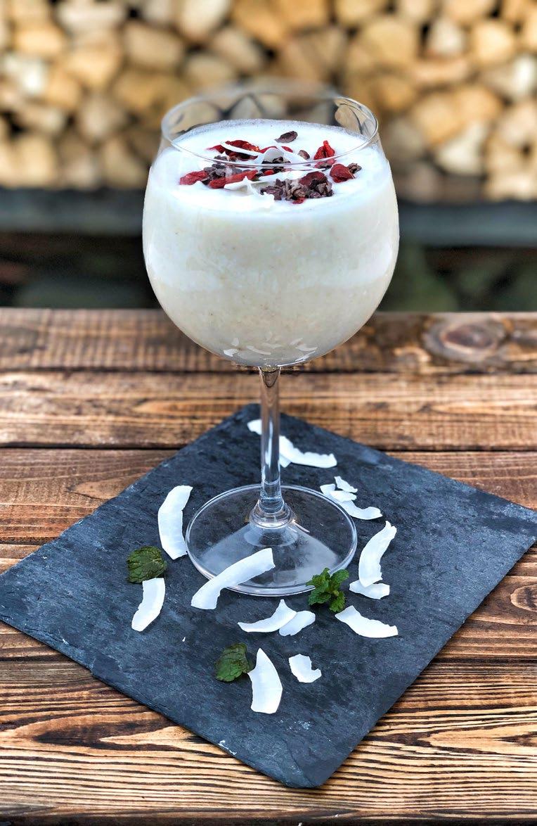 Přelijeme do větší sklenice, a pokud se chceme osvěžit, přidáme pár kostek ledu. Dozdobíme goji, kakaovými boby a mátou.