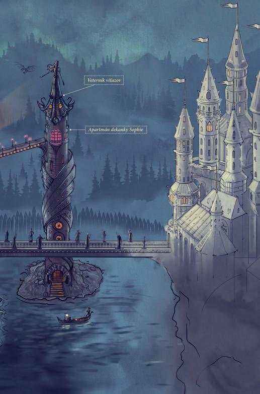 3) APARTMÁN DEKANKY SOPHIE: V súlade s Vašou požiadavkou prestaviame Riaditeľovu vežu na v ašu súkromnú rezidenciu. Vrchné poschodie poslúži ako šatník, kde budú samostatné oddelenia pre topánky, plášte, róby a diadémy rovnako ako vstavaný kozmetický a k adernícky salón so stenami a stropom výlučne zo zrkadiel. Na d olnom poschodí bude rozľahlá jedáleň na oslavy pre hostí. Steny jedálne budú vyzdobené portrétmi Vás, dekanka Sophie, a b udú predstavovať prierez Vaším životom.