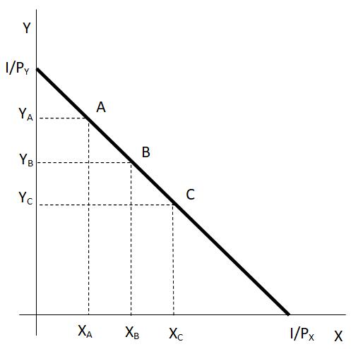 Grafickou intepretaci rozpočtového omezení odvodíme z extrémů, které jsou spotřebiteli k dispozici. Jedním z extrémů je, že by spotřebovával pouze statek Y, množství statku X by tedy bylo nulové a z rozpočtového omezení (1.7) plyne, že maximální množství statku Y, které může nakoupit, by bylo dáno podílem nominálního důchodu a ceny statku Y. Druhým extrémem je situace, ve které by spotřebovával pouze statek X. Toto maximální množství statku X by bylo dáno podílem nominálního důchodu a ceny statku X.