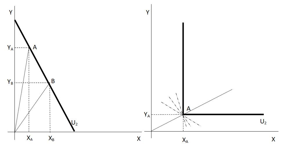 Obrázek (1.4) zachycuje obecný případ dokonalých substitutů a dokonalých komplementů. Dokonalé substituty jsou charakterizovány konstantní mírou substituce ve spotřebě. To znamená, že indiferenční křivka je lineární. Mezní míra substituce ve spotřebě je tedy dána směrnicí samotné indiferenční křivky. Z pohledu vztahu (1.5) je důsledkem to, že sice se mění poměr množství statků X a Y ve spotřebním koši, ale při limitně nulové změně mezní míry substituce ve