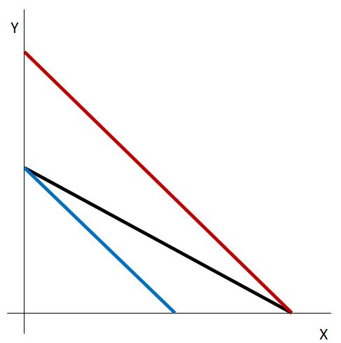 Obrázek 1.6: Pokles ceny statku Y (červeně) a růst ceny statku X (modře) (vlastní zpracování)