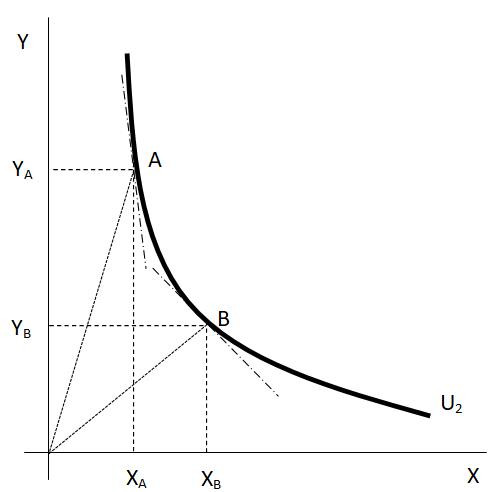 konvexní. Ekonomické vysvětlení souvisí s tím, že funkce mezního užitku je klesající. Pokud spotřebitel při dané výši užitku U2, zvyšuje množství statku X ve spotřebním koši, z předchozího víme, že nutně musí klesat množství statku Y ve spotřebním koši. Dále však také platí, že s tím, jak konstantně zvyšuje spotřebu statku X, klesá vzácnost statku X, tedy jeho mezní užitek. Na druhé straně, s tím, jak omezuje spotřebu statku Y, roste jeho vzácnost, tedy jeho mezní užitek. V důsledku klesající vzácnosti statku X klesá schopnost statku X nahrazovat stále vzácnější statek Y. Proto na stejné přírůstky statku X ve spotřebním koši připadají nižší úbytky statku Y.