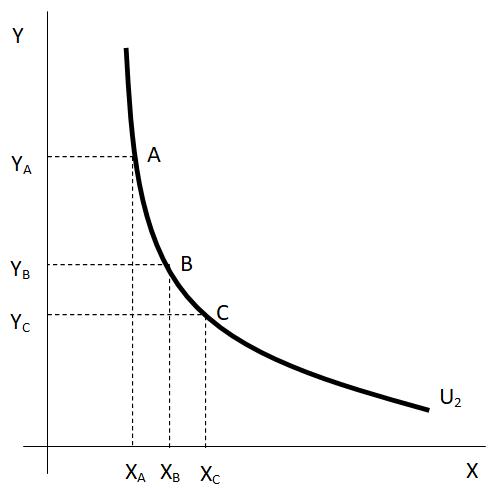 Na indiferenční křivce v obrázku 1.2 jsou zaneseny další dva spotřební koše: B a C. Snadno si lze všimnout, že přírůstek statku X mezi spotřebním košem A a B je stejný jako jeho přírůstek mezi B a C. Na druhé straně je patrné, že úbytek statku Y mezi spotřebním košem A a B je vyšší než jeho úbytek mezi spotřebním košem B a C. Tato skutečnost v technické rovině pouze odráží to, že indiferenční křivka není lineární, ale