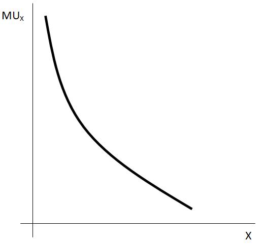 Technicky vzato to znamená, že derivace mezního užitku podle spotřebovávaného množství daného statku, jinými slovy druhá derivace funkce užitku podle množství daného statku, je záporná. Mezní užitek tedy můžeme zachytit jako klesající, avšak kladnou funkci tak, jak je vidět na obrázku 1.1.