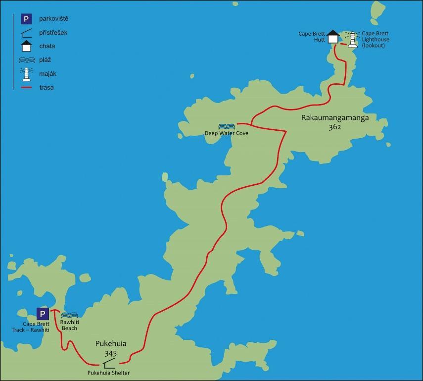 Track začíná na pravé straně silnice vedoucí do Rawhiti. Po krátkémpočátečnímstoupáníturistédorazínarozcestí,kdejevstupní bránatracku.Zrozcestíselzepodruhécestědostatběhem5minut naplážOkeBay,kterápatříknejkrásnějšímvceléoblastiBayof Islands.Koupánínatétoplážijepromnohépříjemnýmzačátkem tracku.Pokrátkémosvěženínicnebránínávratukevstupníbráně azahájení opravdového stoupání buší. Track po celou dobu připomínáhorskouhřebenovkuacestavedestrměnahoruadolů.Pro informacijekaždýzdolanýkilometroznačenznačkou.Výhledyjsou opravduskvostné.TuristémajícelouoblastBayofIslandsjakona dlani.NajižnístraněmohouobdivovatpohlednaWhangamumu Harbour.Nakoncinejdelšíhostoupáníjedřevěnýshelter,kdesilze dopřát zasloužený oběd, ovšem zvlastních zásob. Zhruba po 4–5 hodináchcestysenacházírozcestíkzátoceDeepWaterCove.Pokud jehezképočasíadostatekčasu,doporučujizátokunavštívit.Jetotiž ideálníprokoupáníapotápění.Velmičastojetadymožnéspatřit rejnoka.Dalšícestaodzmíněnéhorozcestíjedalekoobtížnějšínežze začátku.Každýkilometrjezasloužený.Odměnouzavynaloženéúsilí jezávěrtracku,kterýmješpičkapoloostrovaCapeBrett.Nejprve turistédorazíkmajákuCapeBrettLighthouse,odkudjejižvidět CapeBrettHut,překrásnémístopronocleh.Výhlednamoře,lodě, skályaútesyjenaprostostrhujícíaturistézdestrávínádhernývečer. Přitrošeštěstílzespatřitivelryby.Dominantouceléhovýhleduje