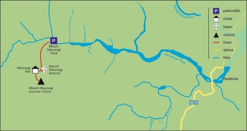 TrackzačínápřímoubudovysprávcePakihiroaStation.Jeznačen velkýmižlutýmikůlyapraktickykopírujecestupro4WDvozidla. CelývýstupnaHikurangiHutmírněstoupá.Cestoupozorujeme nesčetnémnožstvíkravaovcí.Nádhernýjeivýběhskoňmivšech barev.ZlevanáspoceloudobudoprovázejíhoryWharekiaazpravé strany můžeme obdivovat Whanokao aPuketauhinu. Přímo před turistyseotevírádominantníhoraHikurangi,najejímžhřebenujepo časeviditelnátakéHikurangiHut.Zhruba30minutpředchatouje rozcestí,kdejemožnépokračovatpocestěpro4WDkposvátnému místusmaorskýmitotemy.Tatocestaneníznačena.Totemůjezde hodně, proto turisté krátkou 30minutovou odbočku ocení. Od rozcestíjetrackznačenstáležlutýmikůly,aleneníjižvedenpocestě pro4WDajedivočejší.Chatajižnenídalekoodzmíněnéodbočky, nebýváobvykleplnězaplněnaajenádhernýmmístempronocleh. Pokudchtějíturistédorazitnavrcholsvýchodemslunce,jenutnési naříditbudíkraději3hodinypředsvítáním.