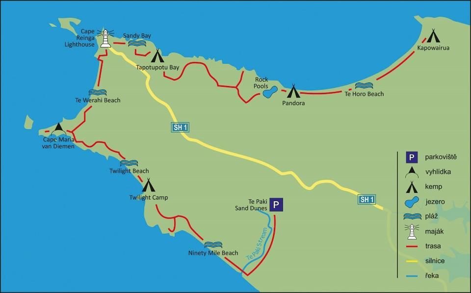 okolníkrajiny,cožhodněturistůuvítá.Největšípísečnédunybudou vzávěrečnéčástitracku.Po2hodináchcestyodCapeReingaje možnákrátkáodbočkanapoloostrovCapeMariavanDiemen.Track vedeažnakonecpoloostrovakWaitapuPointLighthouse.Zdeje možné obdivovat výhled na blízký ostrov Motuopao Island. Celá odbočkatrvápřibližně90minut.Posledníplážínatrasetohotodneje TwilightBeach.VporovnánísTeWerahiBeachjetadymnohem méněnávštěvníků.Oprotizálivům zprvníhodnezdemohoubýt větší vlny, proto je nutné dbát zvýšené opatrnosti při koupání.