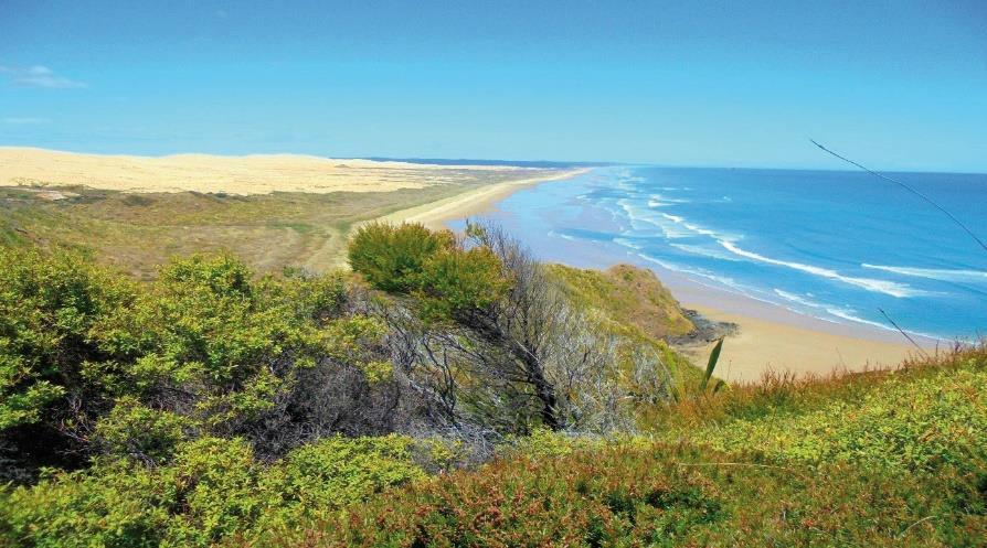 odlivu. Cesta po této pláži pešky vrámci tracku zabere více než hodinu.Potéjenutnoodbočitvlevovmístě,kdeústíTePakiStream domoře.TrasadálevedepodélTePakiStream,vedlekteréhojerušná cestavedoucínaNinetyMileBeach.Naštěstítentoúseknetrvádéle než90minut.TrackkončínaparkovištiTePakiSandDunes.Jsouto největšípísečnédunyseverníhoostrova.Kdomázájem,můžeduny sjíždětnazapůjčenémsandboardu.Jízdanasandboarduzmírných istrmých dunmůžebýtkrásnýmzakončením tohoto pobřežního tracku.